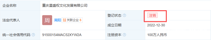 该公司成立于2022年12月,法定代表人为周阳,注册资本100万元人民币,经营范围包括组织文化艺术交流活动、企业形象策划、市场营销策划、品牌管理等,由周阳、王洪全(网红王红权星)分别持股52%、48%。值得一提的是,目前,王洪全名下3家企业均已注销。