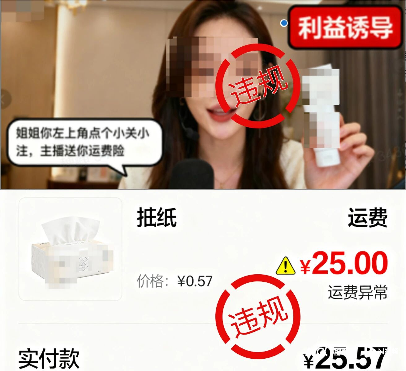案例一:违规引流营销。部分商家、达人通过虚假套路等违规手段吸引消费者下单。例如达人在直播间以“点击关注送运费险”的方式诱导用户互动,或商家以低于正常价格售卖商品,但收取异常高的运费等价格作弊方式,给消费者造成体验损失等。