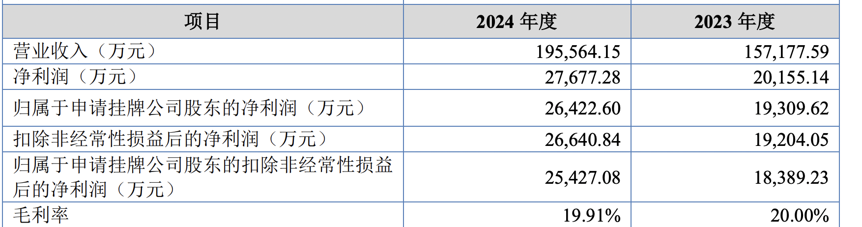 2024年,莫森泰克营业收入为19.56亿元,同比增长24.42%;归母净利润为2.64亿元,同比增长37.32%;毛利率为19.91%,上年同期为20%。