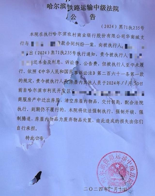2024年11月12日,吴女士看到商铺门口贴上了哈尔滨铁路运输中级法院的《公告》【(2024)黑71执235号】,称哈尔滨农村商业银行有限公司华南城支行与孟某、李某借款合同纠纷一案,因被执行人孟某、李某未履行偿还责任,要求于11月30日前,迁出房屋,清空屋内物品。到期仍不履行,将依法强制执行,强制开锁、强制腾退。